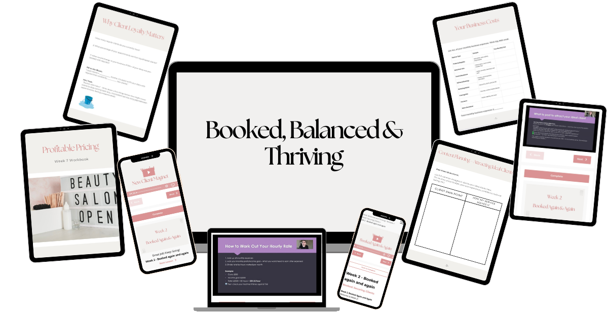 Booked, Balanced and Thriving is your blueprint to a thriving, flexible beauty business. Get the exact steps to show you how to build a profitable, fully-booked business that works around your life - no more burnout, a lot less stress.