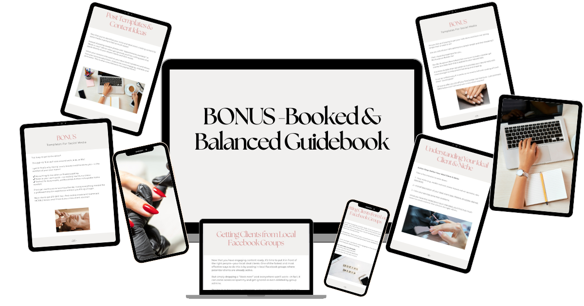 - BONUS: Booked & Balanced – The Nail & Beauty Social Media Marketing Guide! Get done-for-you templates and a proven strategy for using local Facebook groups to attract your ideal clients.